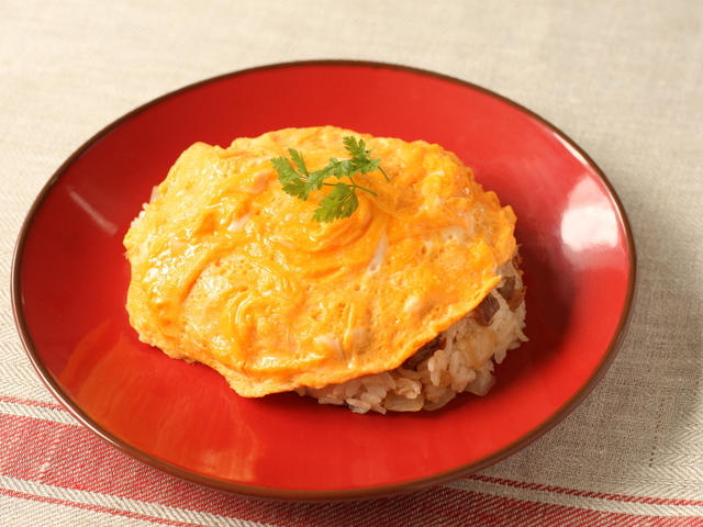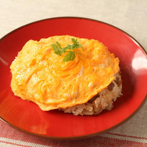 風味の良いバターライスを使ったオムライスがメインの献立です。卵には低脂肪乳を加え、ふわっと仕上げるのが美味しさのポイントです。牛もも肉は脂肪分が少なく、脂肪燃焼をサポートするL-カルニチンや貧血を予防する鉄分などが豊富に含まれていますよ。