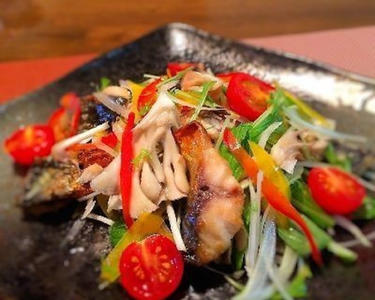 焼いたサバ、2の野菜、ドレッシングを混ぜ合わせます。器に盛って完成です。