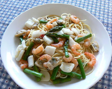 手軽に使えるシーフードミックスや緑黄色野菜を多く使った彩りの良いパスタです。 彩りを添えているアスパラガスには、アミノ酸の一種であるアスパラギン酸が多く含まれており、新陳代謝を促し疲労回復や美肌などの効果が期待できます。