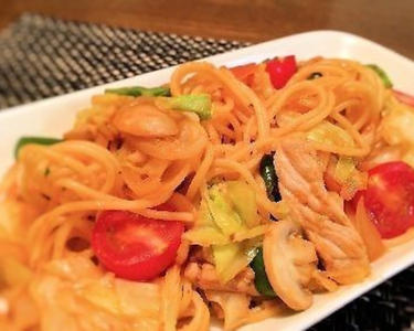 茹でたスパゲッティを加え★印の調味料、トマトを加え炒めます。