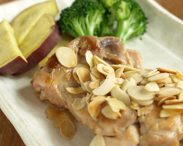 別の鍋で弱火でスライスアーモンドを乾煎りして、鶏もも肉にのせます。