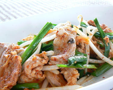 豚肉は一口大、ニラは3cmの長さに切ります。もやしは流水で洗って水をよくきっておきます。