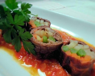 お野菜を牛肉で巻き、シンプルなトマトソースで頂きます。意外なおいしさです。