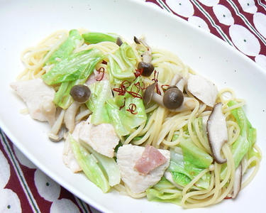 フライパンににんにく、赤唐辛子を入れ、油を熱しにんにくの香が出たら鶏肉とベーコンを炒めキャベツ、きのこ類を加えて炒める。
