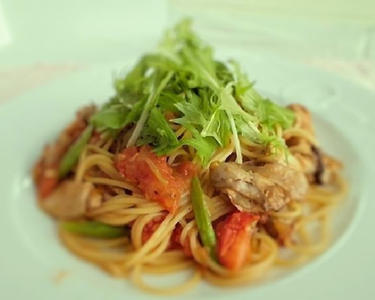 牡蠣をもどし、☆印の調味料で味付けします。スパゲッティを和え、皿に盛り、水菜を飾り完成です。