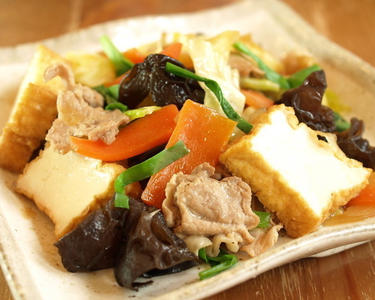 豚肉が白くなったら、厚揚げ、にんじん、きゃべつ、きくらげ、にらの順に強火で炒めます。