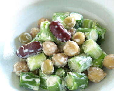 ミックスビーンズやアスパラガスの彩りが綺麗なサラダです。アスパラガスは抗酸化ビタミンが豊富なのでアンチエイジングや美容に効果的です。ハーフマヨネーズを使う事で脂質を抑えカロリーオフにつながります。