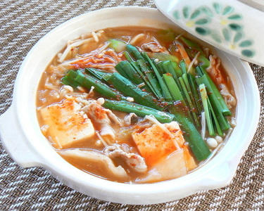 土鍋にだし汁を熱し、キムチを入れ、味を見ながら塩こしょうで味を調えます。