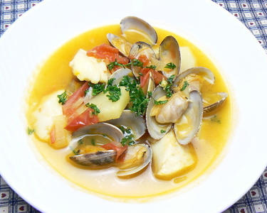 煮立ったら鱈とサフランを汁ごと加え再び煮立ったらあくを取り、弱火にしてあさりを入れます。