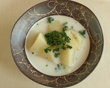 ②に豆乳を入れて温め、塩、こしょうで味をととのえる。