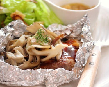 アルミホイルに①を乗せて、★の材料を混ぜ合わせたタレ、ほぐした舞茸、スライスしたしいたけを乗せて包む。