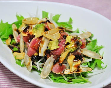 相性の良いアボカドとマグロを合わせ、カリカリのにんにくとごぼうで食感も楽しめます。
