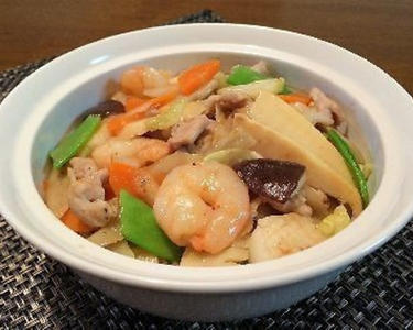 豚肉、魚介類、たっぷり野菜が入ったバランスの良い中華どんぶりです。