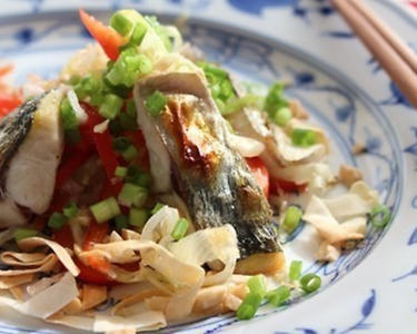 焼いたアジ、長ネギ、パプリカ(赤)を★を混ぜ合たタレで和え、皿に盛り、餃子の皮、小ねぎ、バタピーを添えたら出来上がり。