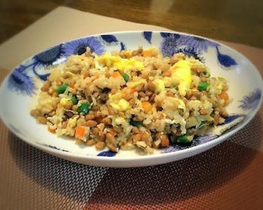納豆、卵、しらす干し、ご飯をほぐしながらいれて、切るように混ぜ、塩、こしょう、醤油、ごま油で味付けします。