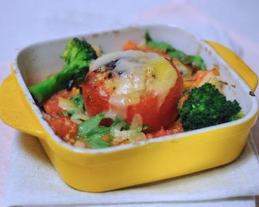 3の耐熱皿の中心に倒れないように2のトマト、ブロッコリーを置きます。250度のオーブンで10分から15分、焼きます。