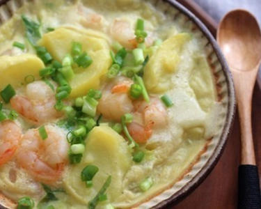 降圧作用が期待できるタウリンが豊富な海老を使ったグラタン。じゃがいもの使用でカリウムも摂取でき、より高血圧予防になります。