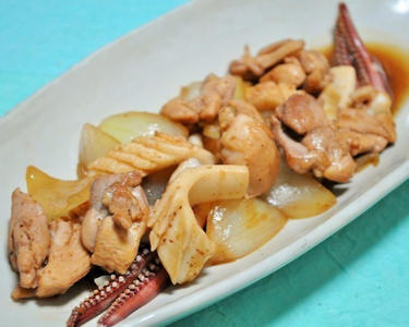 イカ、鶏もも肉、玉ねぎは食べやすい大きさに切り、油をひいたフライパンで炒める。