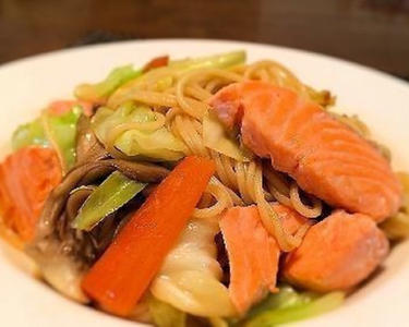 フライパンにサラダ油をひきにんにく、鷹の爪、サーモン、野菜類、キノコ類を炒めます。