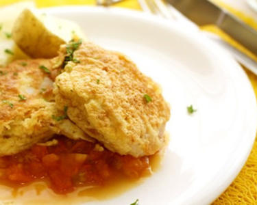 パン粉入りのピカタ衣にすることで、カリっと感が出て、たんぱくなタラが更に満足なものになります。トマトを刻んで煮詰めることにより、旨味が凝縮、それだけなのにとっても美味しいソースに早変わりです。※卵は可食部で50gを目安に。