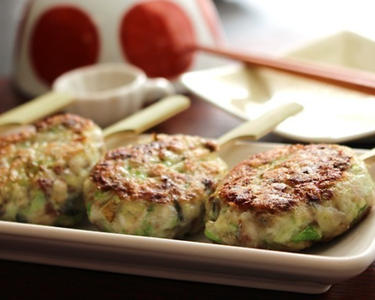 熱したフライパンにオリーブ油をひき、両面こんがり焼いたら、お皿に盛る。※串をさすと、つくね棒っぽいです。