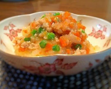 だし汁、冬瓜を鍋に入れ、蓋をして弱火で煮ます。軟らかくなったら、鶏ひき肉、玉ねぎ、人参を加え、良く混ぜ合わせて煮ます。