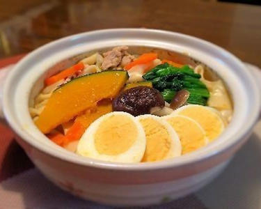 灰汁をとり、うどんを入れ、煮えたら、スライスしたゆで卵をのせて完成です。