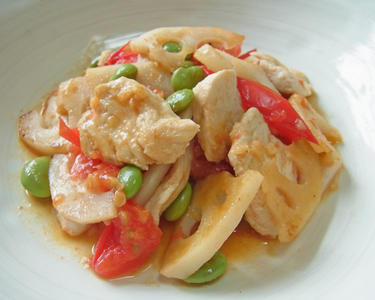 フライパンに油を引き、生姜を入れる。香りが出たら胸肉を入れる。表面に焼き目をつけたら、レンコン、トマトを入れる。