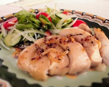 鶏肉は皮を取り、塩、こしょうし、熱したフライパンにサラダ油をひき、にんにくとともに蒸し焼きにします。