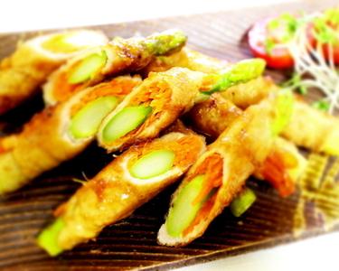 豚肉は塩・黒こしょうで下味をつけ、人参・アスパラガスを並べて巻き、片栗粉をまぶす。