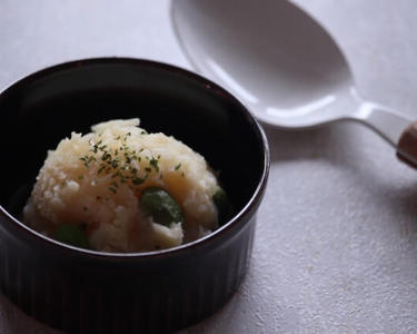 じゃがいもはつぶして、皮をとり、明太子、枝豆、ヨーグルトと合わせ、塩で味を調えます。