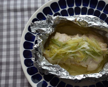 アルミホイルを30cm程度用意し、玉ねぎ、じゃがいも、鶏ささみ肉、ねぎの順で重ねて包む。