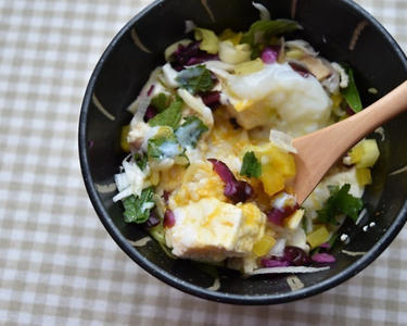 火を使わずにごはんの上に乗せるだけの丼ぶりです。難しいこと抜きでできるのでとってもおすすめです!ガーっと混ぜて食べてください。漬物を入れることでポリポリとした触感を楽しめるので、「噛むこと」を意識できるように工夫しました。お好みで漬物の種類を変えたり、薬味を加えたり、きゅうりなどの生で食べられる野菜を入れてアレンジもできます。
