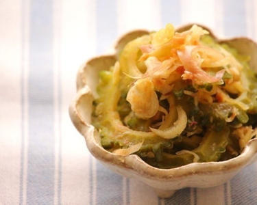ゴーヤを熱湯でさっと茹でたら、みょうが、かつお節、酢、醤油で和える。