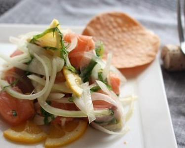 サーモンは一口大に切る。玉ねぎはスライスして水にさらし、水気を切る。 シソの葉は千切りに、レモンは4等分に切る。