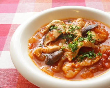 味が淡白な鶏むね肉はうま味成分の強い食材と組み合わせると美味しいおかずになります。余ったトマトホール缶は冷凍保存してスープなどに。