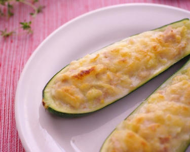 2をズッキーニの外側に詰め、チーズを乗せてトースターで焦げ目がつくまで焼く。