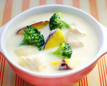 牛乳の代わりに豆乳、バターの代わりにサラダ油を使い、乳脂肪分ゼロでヘルシーにすることができます。具材を煮込む時は、火が通りやすいブロッコリーは、柔らかくなったら出しておくと良いです。