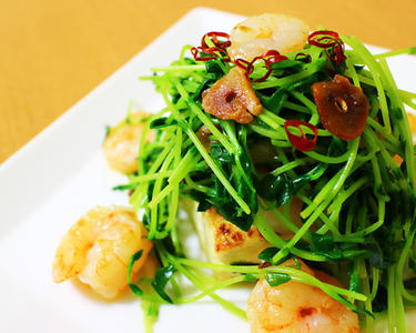 むき海老を加え、色が変わったら豆苗を加え、さっと炒める。
