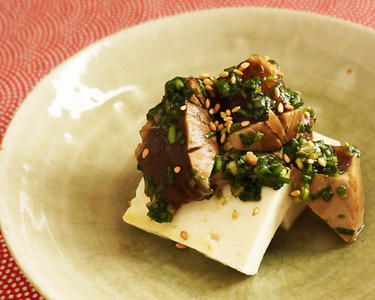 かつおのぶつ切りを①と混ぜ合わせ、豆腐にのせる。