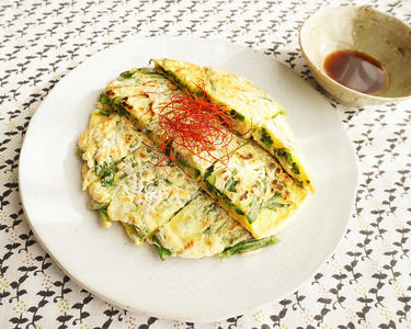 チヂミは、1枚の中に主食(小麦粉)・主菜(卵としらす)・副菜(小葱)がオールインワン!混ぜて焼くだけ、栄養満点な1品🎵
