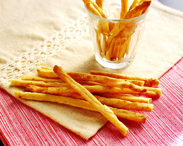 1の生地を薄く延ばして細切りにし、オーブンシートを敷いた天板に並べる。