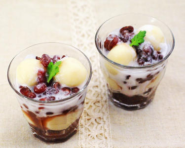 器にゆで小豆と1の白玉を交互に盛り、最後にココナッツミルクをかける。好みの量のミントを添える。