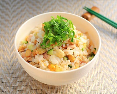 ご飯に、炒り大豆、ツナ、きゅうり、めんつゆを加えてよく混ぜる。