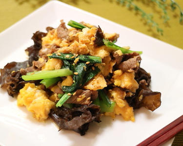 黒きくらげと牛もも肉の卵とじ