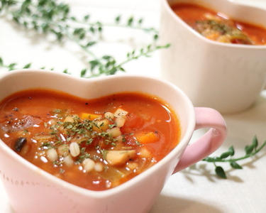 もち麦は大麦の一種で、もちもちプチプチした食感と香り高い味わいが特徴的です。栄養面では、穀類の中で食物繊維が多く含んでいます。腸内環境を整えながらダイエットしたい方はぜひ食べるスープでお腹を満たしましょう。