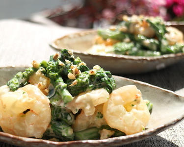 菜の花にはβ-カロテンが特に多く含まれます。β−カロテンは体内でビタミンAに変わりますが、ビタミンAは油と一緒に摂ると吸収率が上がるので、マヨネーズを使う事でより効率的に体内にとり入れられます。辛味が苦手な方やお子様には、ワサビを抜いても美味しく召し上がれます。