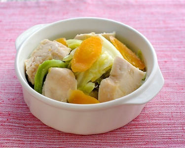 人参に含まれるビタミン・ミネラルは美肌に嬉しい、ビタミンAやビタミンC、ビタミンE、鉄分を豊富に含みます。特にビタミンC・E、鉄分は葉の部分に含まれます。人参を加えて、ビタミン・ミネラルだけでなく、彩りもプラスしましょう。塩・こしょうのシンプルな味付けですが、鶏肉の旨味で美味しく召し上がれます。
