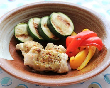 ★を混ぜ合わせて①のささみの上に塗り、野菜は塩こしょうをしてグリルで約6分焼く。