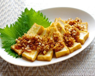 油淋鶏のピリ辛ダレを厚揚げと合わせました。鶏の代わりに厚揚げを使うので揚げ物の手間もなく、ヘルシーに仕上がります。また豆腐は尿酸値を上げる原因になるプリン体の含有量が極めて少ないので、高尿酸血症予防にはおすすめ食材です。